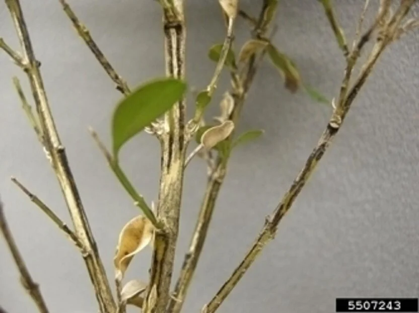 Infected plants become symptomatic in a matter of weeks. The disease causes defoliation of affected stems, and most importantly, if an area/landscape becomes infected, boxwood can never be planted there again as it will inevitably succumb to the disease. It also can become established with minimal symptoms on boxwood relatives Pachysandra and sweetbox (Sarcococca). This can create a disease reservoir on a property that does not have boxwood on it that can affect neighboring properties.