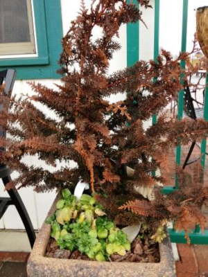 “Really dead” evergreens are brown in a different way. Instead of a gradation of colors from olive-green to bronzy-purple, dead branches are uniformly orange-brown to dark brown. Where a branch with winter bronzing is still flexible and supple, a dead branch is “crispy” and often snaps when bent.