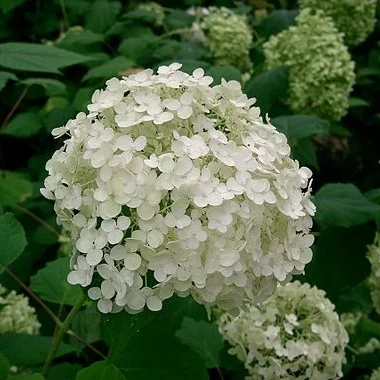 Smooth hydrangea, or Hydrangea arborescens is probably best known by the cultivars ‘Annabelle’, ‘Incrediball’, and ‘Invincibelle Spirit’. It will rebloom through the summer on new growth and can be used as a cut flower.