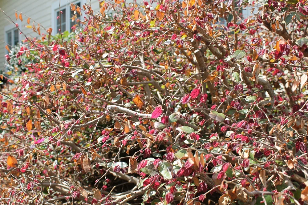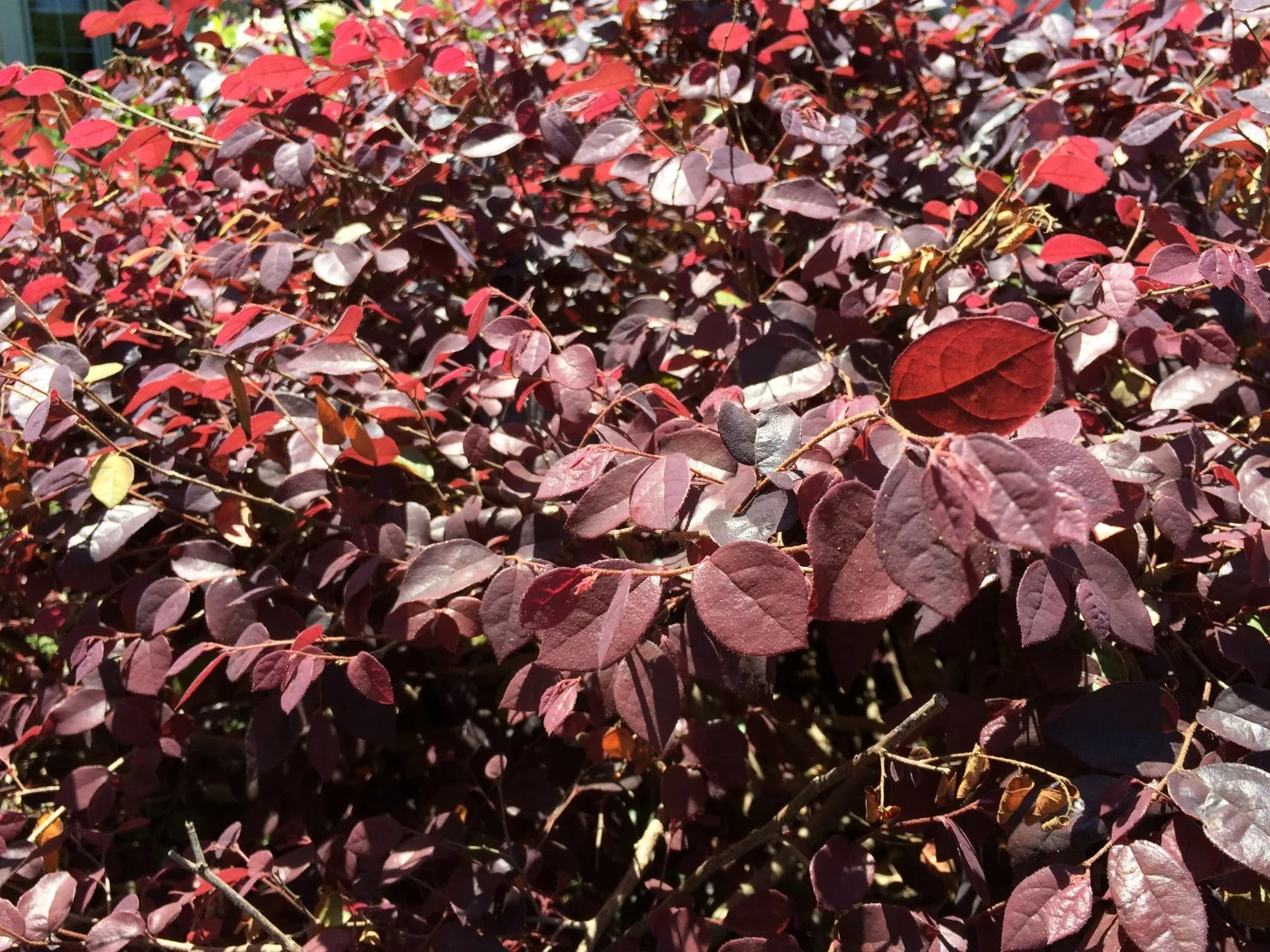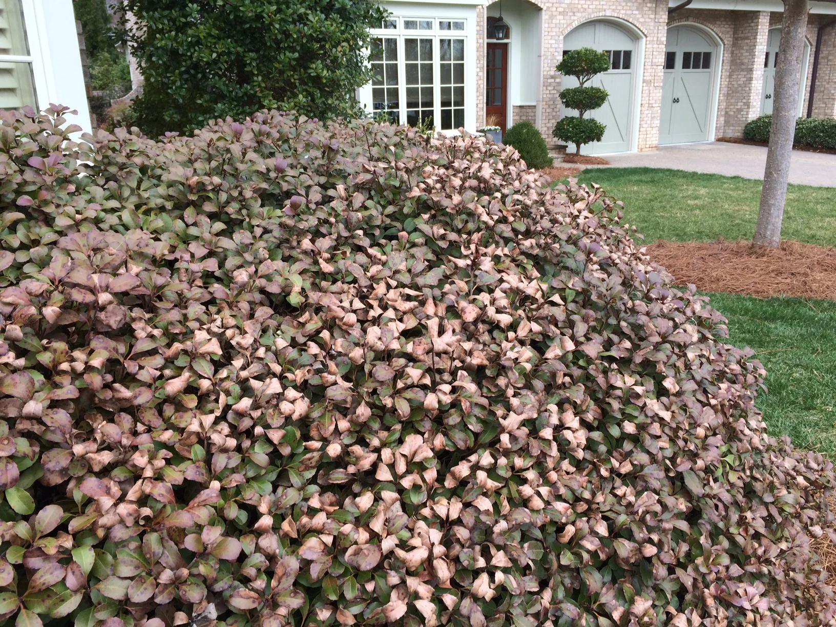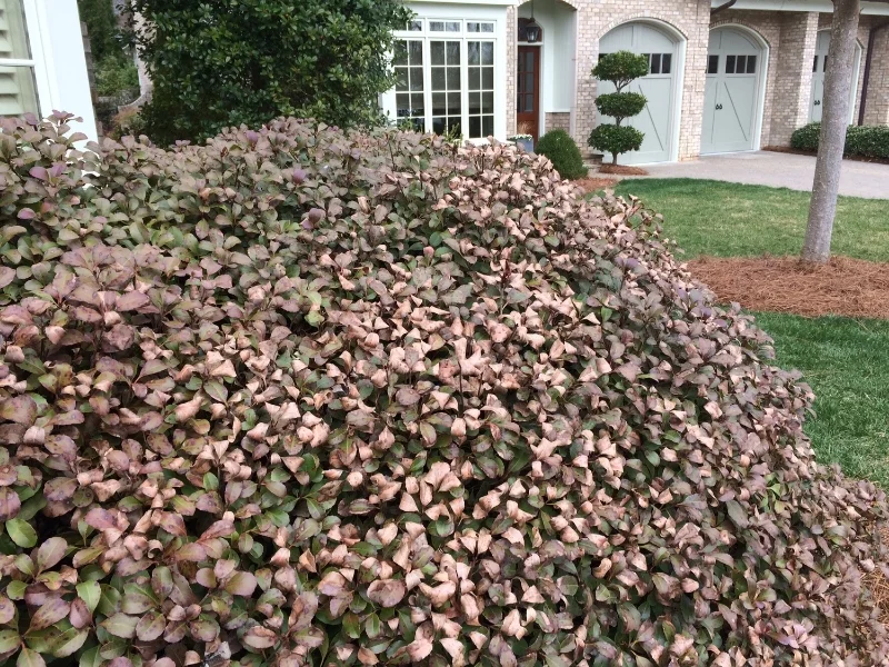 UPDATE: Same Loropetalum in May. Completely rebounded from the winter burn it had. The burned leaves were never pruned, most have fallen off on their own or been completely covered by new growth.