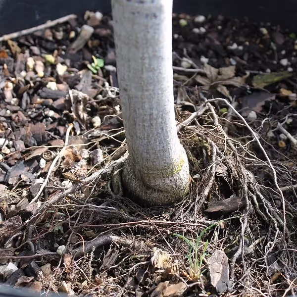 Finally, check that the trunk flare is visible above the soil level. There should be a slight widening of the trunk above soil level, possibly with a change of texture. If it’s not visible, gently remove soil from the top of the root ball until you can see it. You may end up removing some roots along with soil if you need to do this, which is a good thing. These roots can become circling roots that can end up strangling the tree in the future.